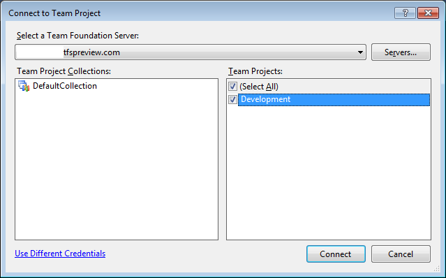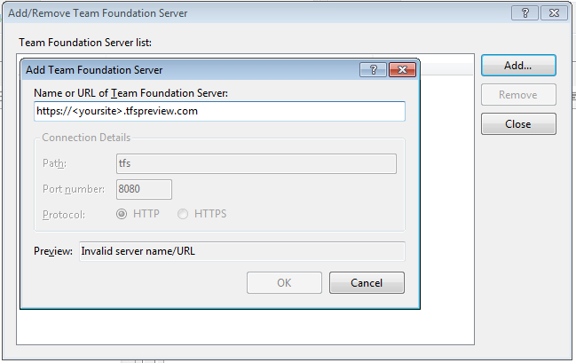 Since this it the first time you’ll be connecting, click on the Servers.. button, and then click on the add button in the next dialog. Use the URI listed on your TFSPreview administration page (in the form .tfspreview.com">.tfspreview.com">.tfspreview.com">.tfspreview.com">.tfspreview.com">https://<yoursite>.tfspreview.com):