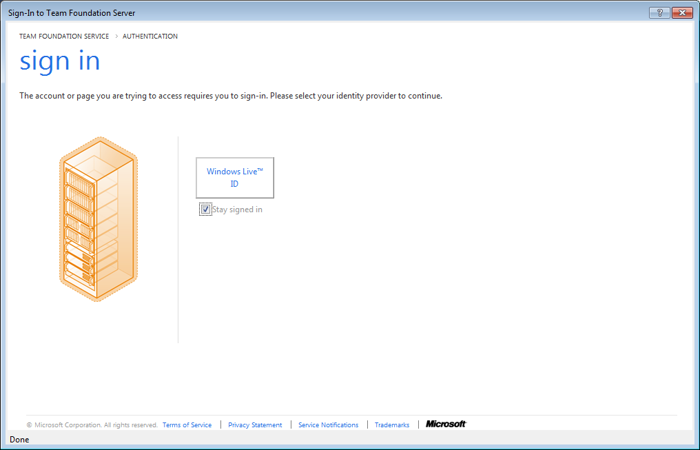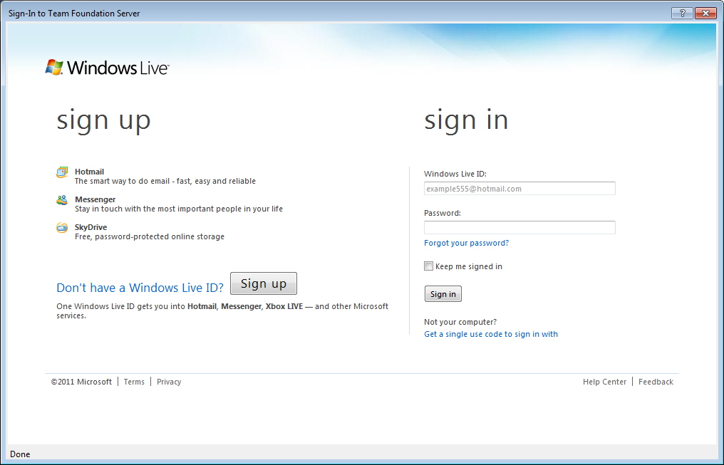 Selecting the default provider, we’re taking to Live to sign in – use the same credentials you registered your TFS service with (for best results). You can create or assign other IDs later on.