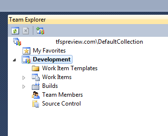Once opened, Team Explorer should populate as if the TFS service was not cloud based, which means we should be able to use TFS more or less as we would normally, i.e. source control, work items etc..