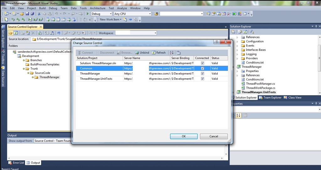 Open the solution you’d like to manage under TFS Azure, connect to your TFS Azure account (follow steps in Part 2), and then add your solution to Source Control as you would for a normal solution. I prefer to add my solution structure to the source control directory before opening the solution. This makes it easier to bind.