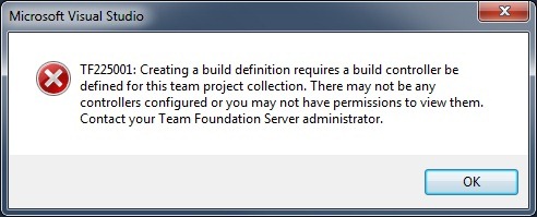 “TF225001: Creating a build definition requires a build controller be defined for this team project collection.”