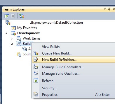 Configuring automated builds, however, pose a tougher problem to solve. First, I tried to create a build definition myself, as I would with TFS 2010. I navigated my way to the Team Explorer window and right clicked on Builds and tried to create a “New Build Definition”: