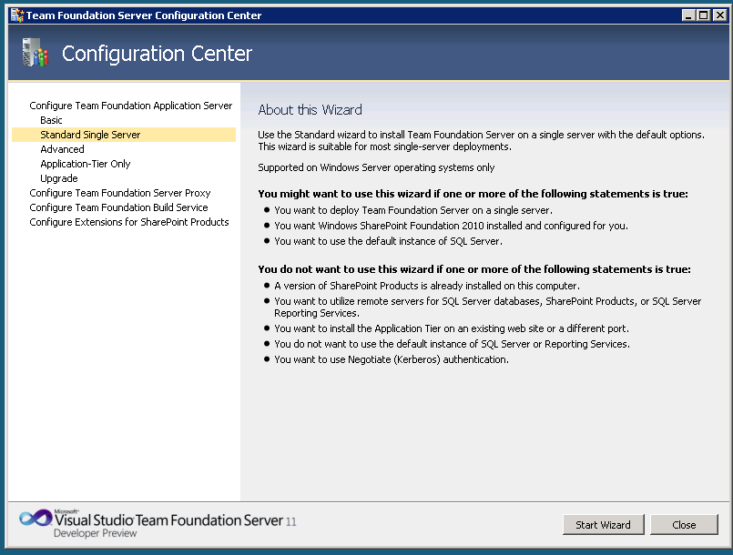 Once you’ve downloaded and mounted the TFS 2011 Developer Preview image, you’ll need to run the TFS Server install. I realise that a separate installer for the build parts would be *far* more convenient, but you have no choice in the matter, it seems: