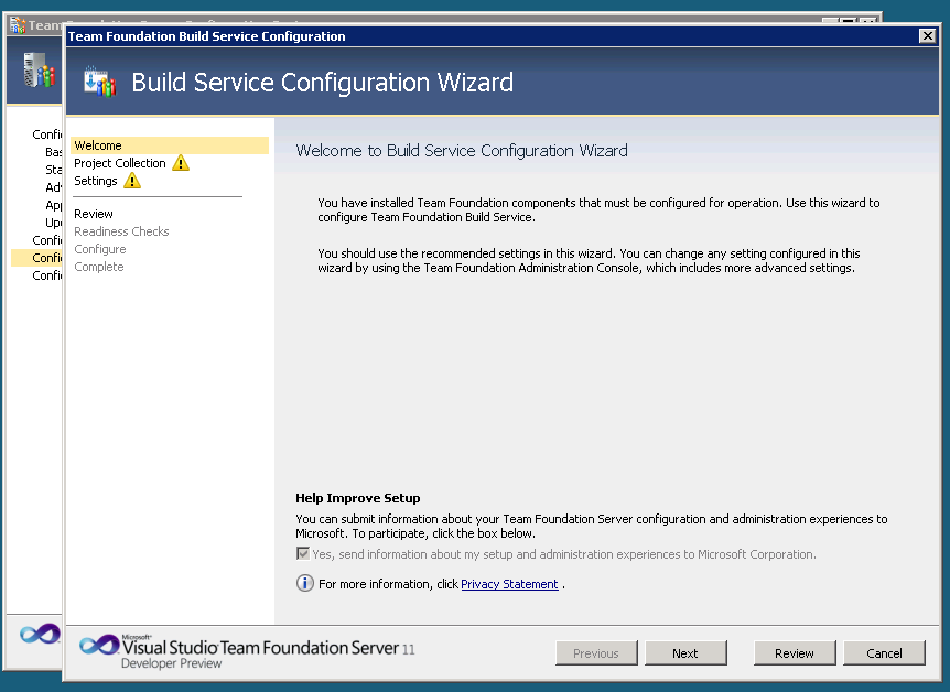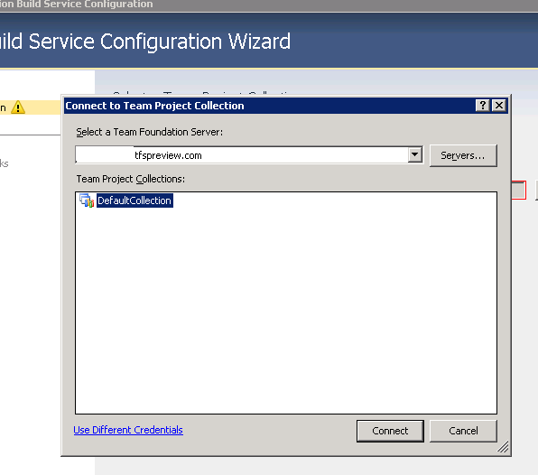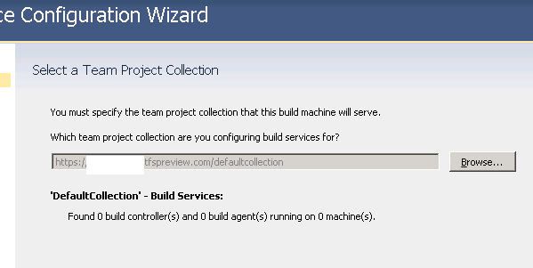 Once you hit the welcome page, click “Next” ton configure your Build Service installation. On the second page you’ll have to select your Team Collection, you do this in much the same way as from Team Explorer (refer to Part 2 for details).