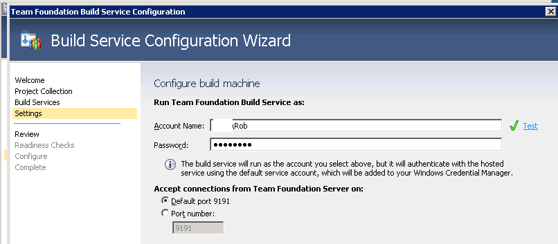 On the next page, we’ll be prompted to provide credentials for the Build Service to run under. Note that you can change the default port that the service will use to communicate with TFS Azure (9191 by default). You might want to ensure you’ve opened the port with your firewall (or other systems). Don’t forget to click on the “Test” hyperlink to authenticate the credentials you’ve supplied.
