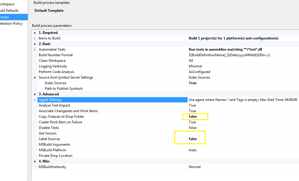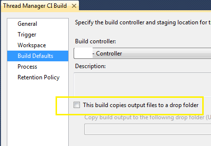 Now I can configure my build as I normally would. For my first build, I’m not going to bother with a drop folder, so I unchecked this option (above) and also in the Process configuration: