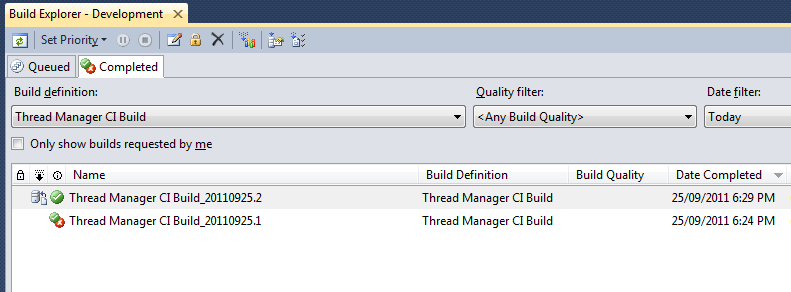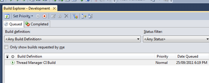 Now that we’ve configured a Build Controller.. we can return to Visual Studio 2010. I refreshed my Team Explorer, then right clicked on the Build item and selected “New Build Definition”. This time, a different result – success.