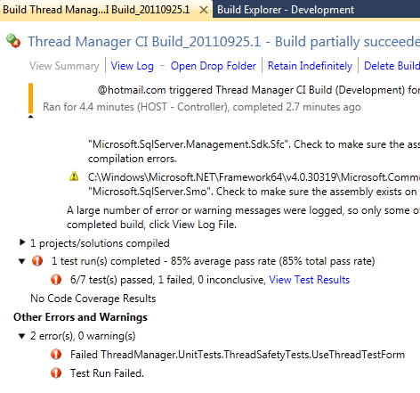 My initial build built, but failed the unit testing. This was caused by one of the tests which launches an interactive WinForm. Commenting out this form, and checking in, triggers the automatic Continuous Integration build. With luck, everything passes the second time: