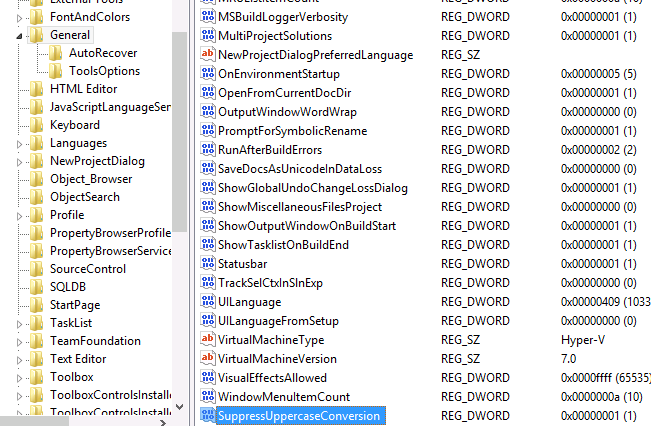 HKEY_CURRENT_USER\Software\Microsoft\VisualStudio\11.0\General\SuppressUppercaseConversion