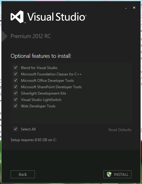 Which launches a revamped installer in the new metro look and feel. First thing to note is that, by default it seems that Visual Studio wants over 8 GB of your hard disk space (so plan accordingly!).
