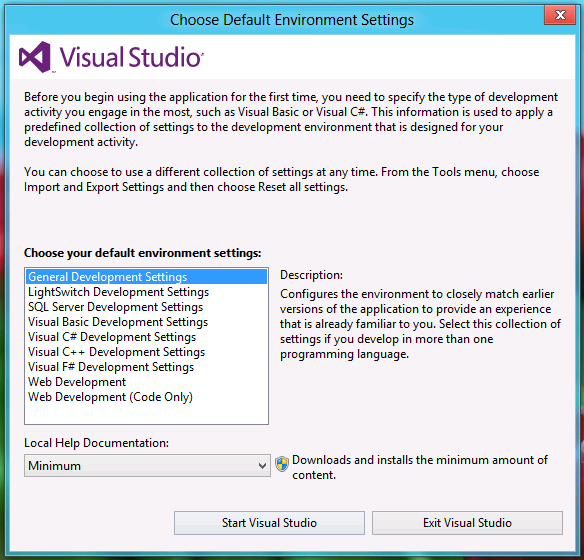 Once we elect to ‘Start Visual Studio’ we are greeted with the pain-in –the-ass configuration dialog – the developer’s nemesis since the days of integrated offline help index merges were introduced: